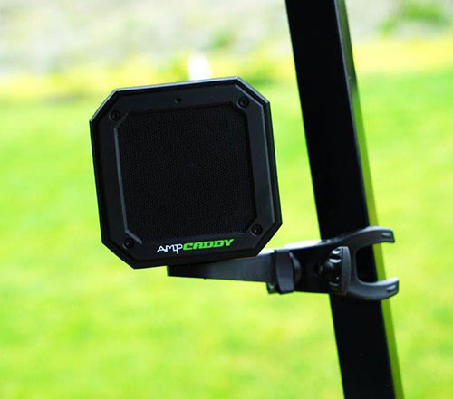 The Ampcaddy speaker is everything you need it to be out on the course. It has a portable and easy to use mount that secures on to most golf cart frames, or to any secure shaft with a diameter between a half inch to two inches wide. The speaker was designed for outdoor trajectory and will provide great bass with battery life to last you up to two rounds of golf. Once secured, the speaker can swivel left to right and right to left, to ensure the sound will carry to you when you are on the tee box or on the green.
